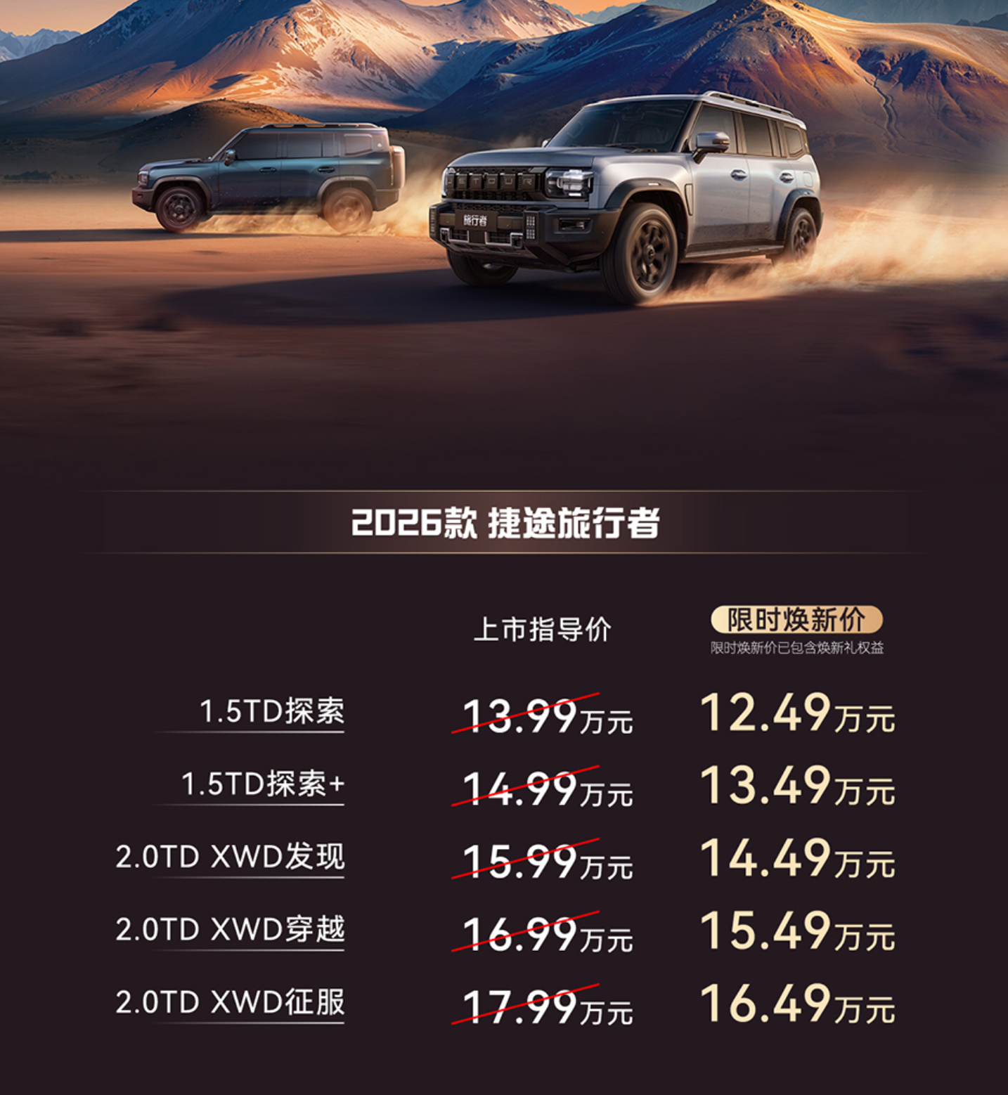 本次活动中,2026款捷途旅行者正式上市。2026款捷途旅行者,限时焕新价12.49万元—16.49万元。