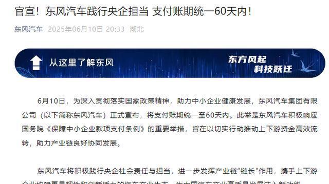 东风汽车强调此举是积极响应国务院《保障中小企业款项支付条例》的重要举措。