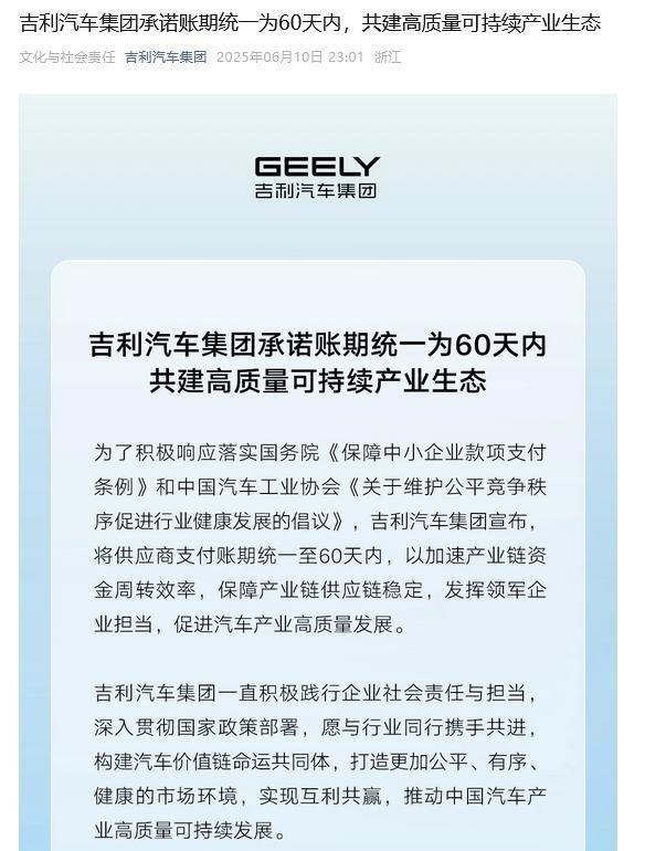 2024年6月10日至11日,广汽集团、中国一汽、东风汽车、赛力斯集团、吉利汽车集团、长安汽车、比亚迪等车企集体宣布,将供应商支付账期统一至60天内!