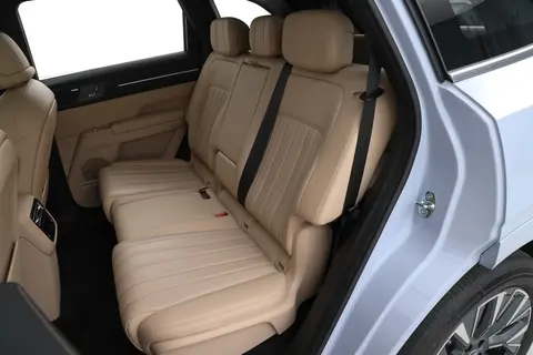 捷途山海L7 PLUS的车内采用了2+3+2的座椅布局方式,主驾驶和副驾驶的座椅都支持电动调节,这个仿皮的座椅舒适性还不错,我身高是177cm,体重是150斤,坐在上面包裹感很好,主驾驶的腰部这里是可以电动调节的,可以对我的腰部有更好的支撑。第一排的座椅支持加热、通风、记忆和按摩,配置已经很齐全了。第二排这里的座椅也可以电动调节,前后还有靠背角度,并且后排这里是有小桌板的,把手放在这上面玩手机,或者在这里放一个Pad看电视都挺舒服的。我在第二排这里的腿部空间差不多是一拳半左右,头部空间大概有两拳,这个空间我还是很满意的。来到第三排这里,我的腿部空间还剩下半拳,这里的横向空间是够用的,坐下两个人之后中间还留有空间,不会觉得很拥挤。其实选择7座版本平时可以当做五座车来开,只要将第三排的座椅放倒就可以了。
