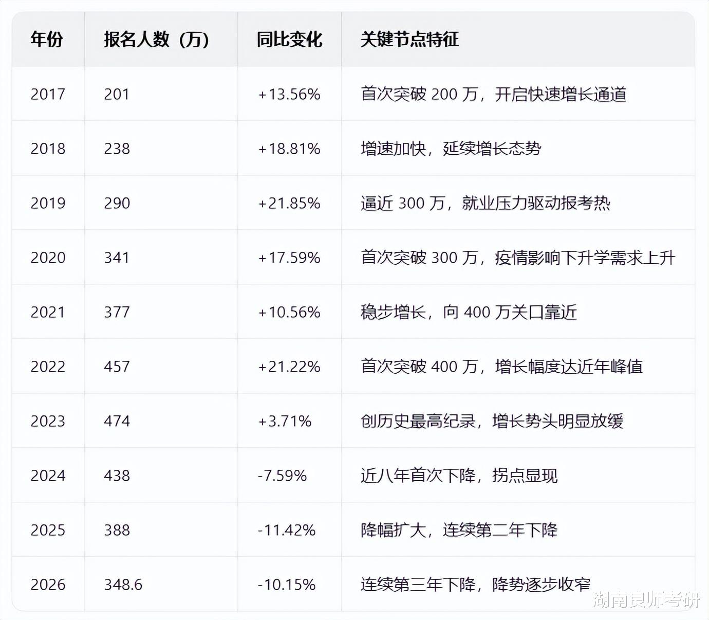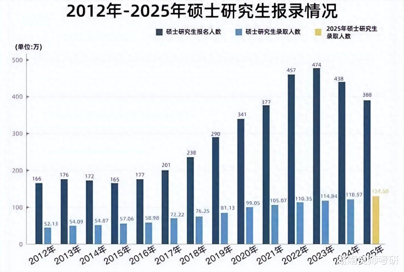从这几年数据来看,考研报名人数已经连续几年下降,2023、2024、2025年考研报名人数分别为474万、438万、388万。