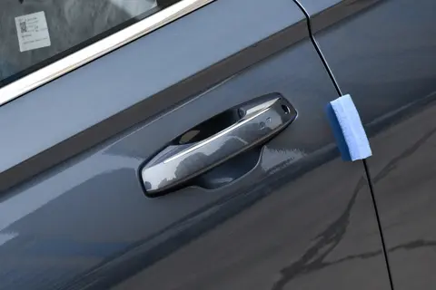 车侧的线条也很流畅,车顶行李架和窗框的镀铬条形成了双腰线的效果,看着不臃肿。门把手是机械的,但表面有防指纹涂层,平时摸完不容易留印子,这点设计很贴心且实用。轮毂是20寸的五辐涡扇造型,配的245mm宽的轮胎,看着运动感十足,抓地力也不差。翼子板上还加了新的侧摄像头,后来才知道是给辅助驾驶用的。