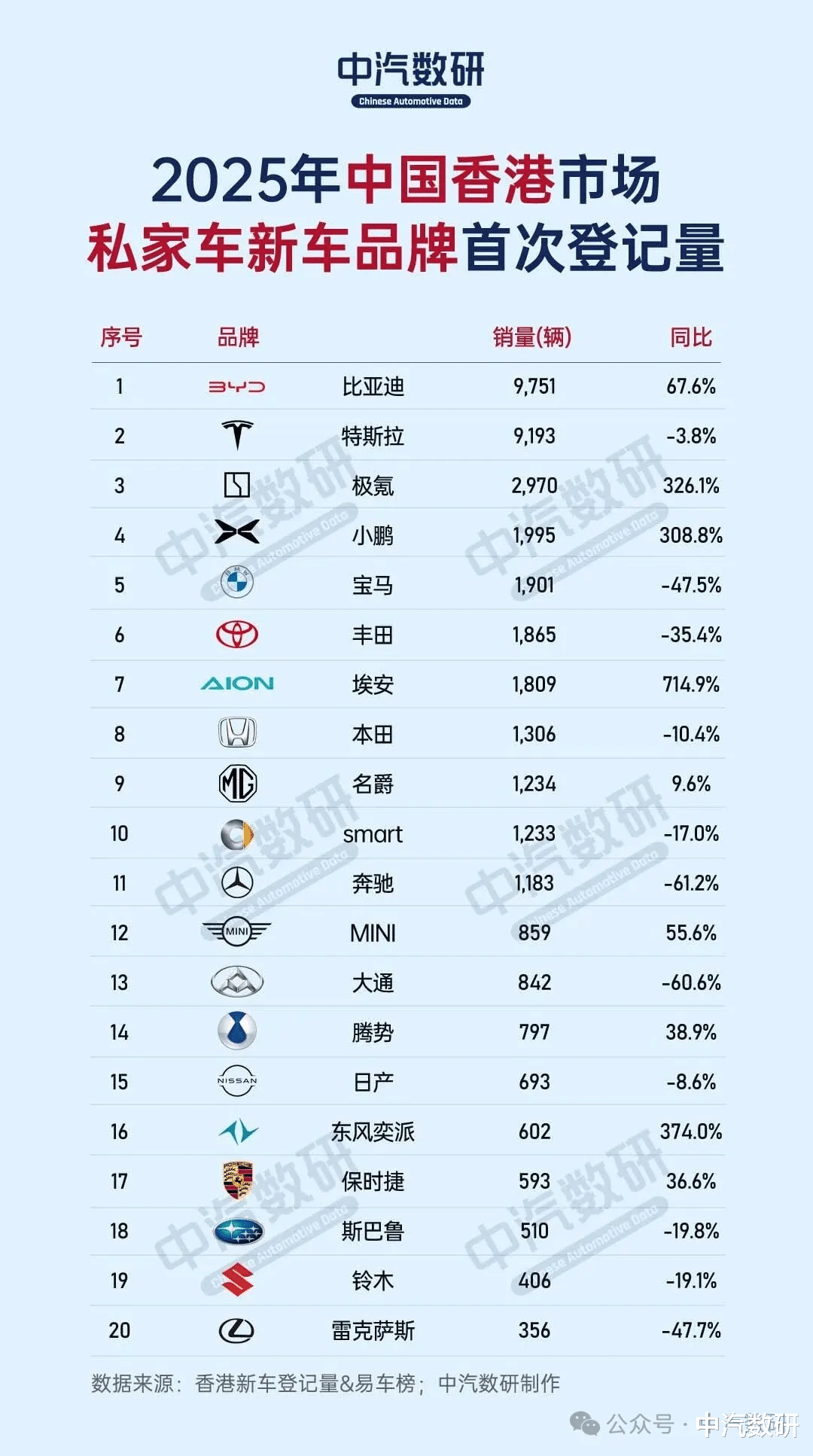 近日,2025年中国香港私家车新车登记数据出炉,自主新能源品牌地位稳健,比亚迪反超特斯拉登顶品牌榜,极氪、小鹏、埃安等新势力增速持续升高,传统豪华品牌则集体下滑。