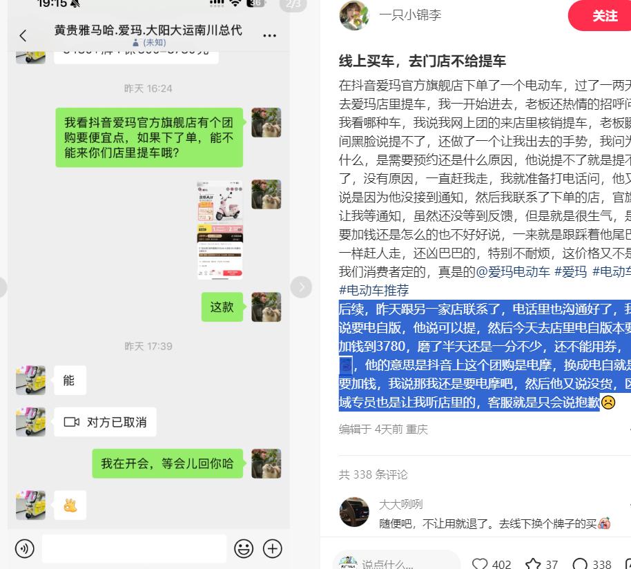 店主的的意思是抖音上这个团购是电摩,换成电自就是要加钱,网友说那我还是要电摩吧,然后他又说没货,区域专员也是让我听店里的,客服就是只会说抱歉。