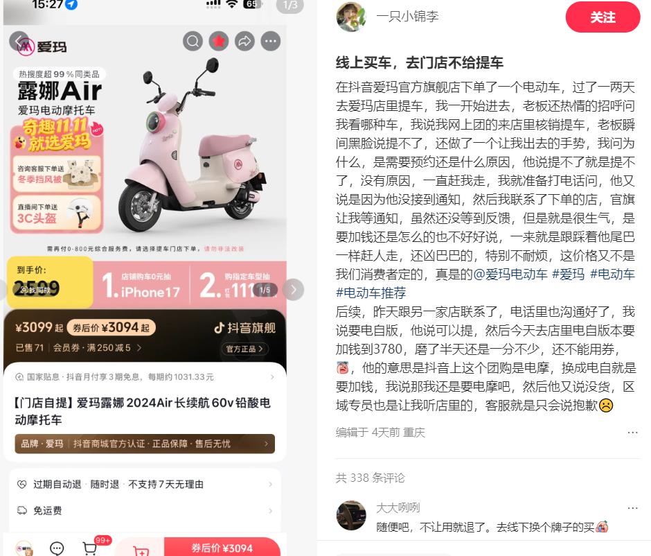 这名网友表示,在抖音爱玛官方旗舰店下单了一个电动车,过了一两天去爱玛店里提车。