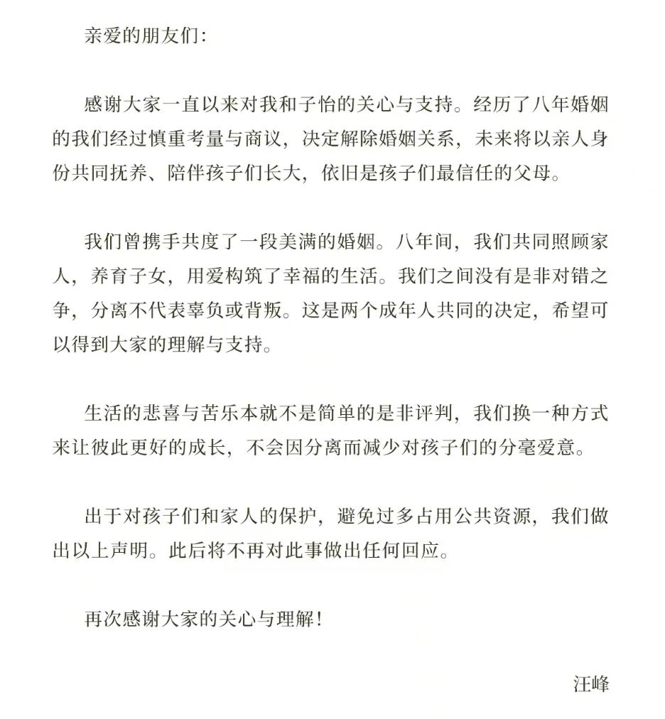 很显然,在日常分享的生活照来看,她与汪峰也的确经历了一段非常甜蜜的时光,但这种幸福并没有维持多久,2023年被一封声明给打断了。