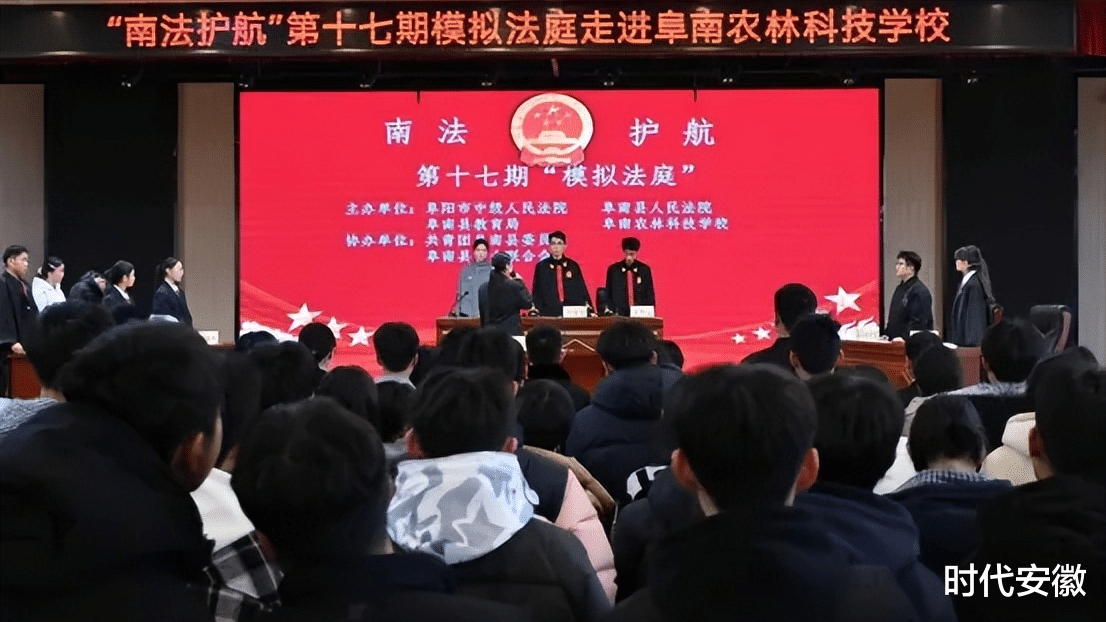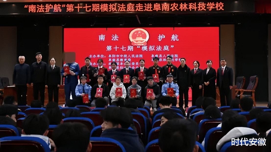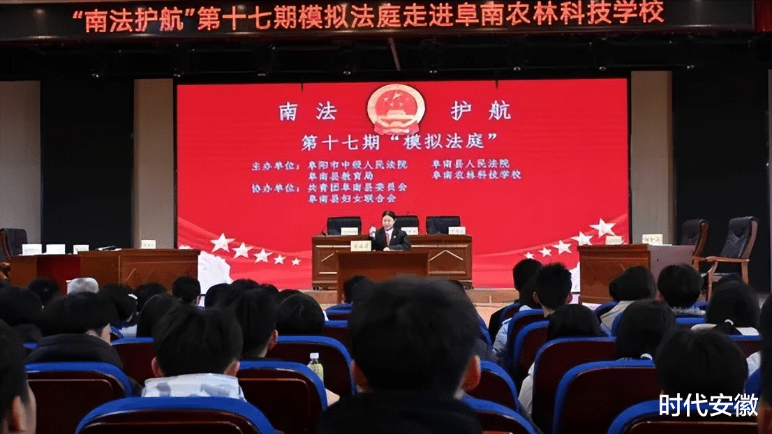 为深入贯彻法治教育理念,切实增强未成年人的法律意识、安全防范意识及自我保护能力,构筑平安、和谐、文明的校园法治环境,2025年12月2日下午,我校与阜南县人民法院紧密协作,在校报告厅联合举办了“南法护航”第十七期模拟法庭进校园活动。本次活动以“反对校园欺凌,守护青春成长”为主题,通过高度还原的沉浸式庭审体验,为现场师生上了一堂生动而深刻的法治实践课。2025级全体师生及2024级部分师生共同参与了此次活动。