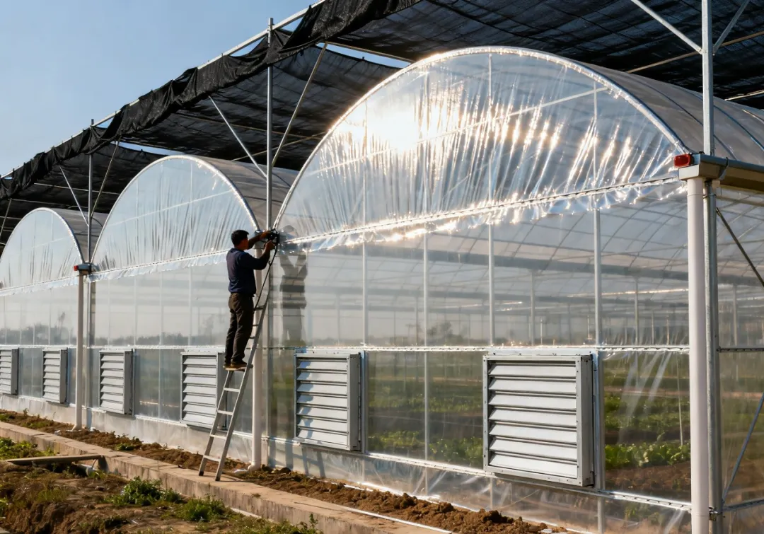 双层薄膜的设置也有多种方式。你可以选择直接覆盖双层薄膜,也可以利用双层充气膜。双层充气膜是通过离心风机在两层薄膜之间鼓风,形成稳定的空气层,使温室内温度变化更加平缓。虽然双层充气膜的透光率较单层膜降低约10%,但其密封性和保温性更好。