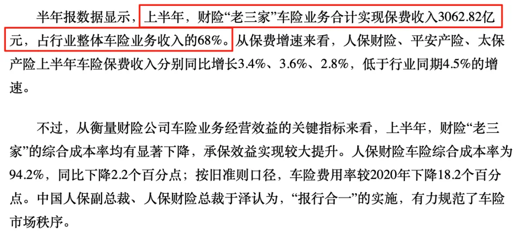 今年上半年,人保财险、平安产险、太保产险车险业务合计实现保费收入3062亿元,占行业整体六成以上。不过在关键指标上,人保财险车险综合成本率为94.2%,平安产险车险综合成本率为95.5%,太保产险车险综合成本率为95.3%。