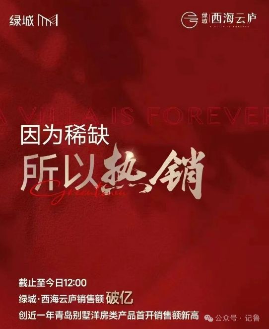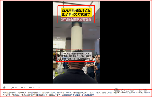 这绿城西海云庐位于长江东路161号,位置较为偏僻,不仅比不上唐岛湾核心区,周边配套也相对较差,既没有大商场、高端购物中心等商业配套,优质学区资源更是匮乏。可就在这样的情况下,项目却突然冒出 “破亿” 的销售成绩,难免让人怀疑:这是否是先 “吹个牛”,试图将房价炒上去?