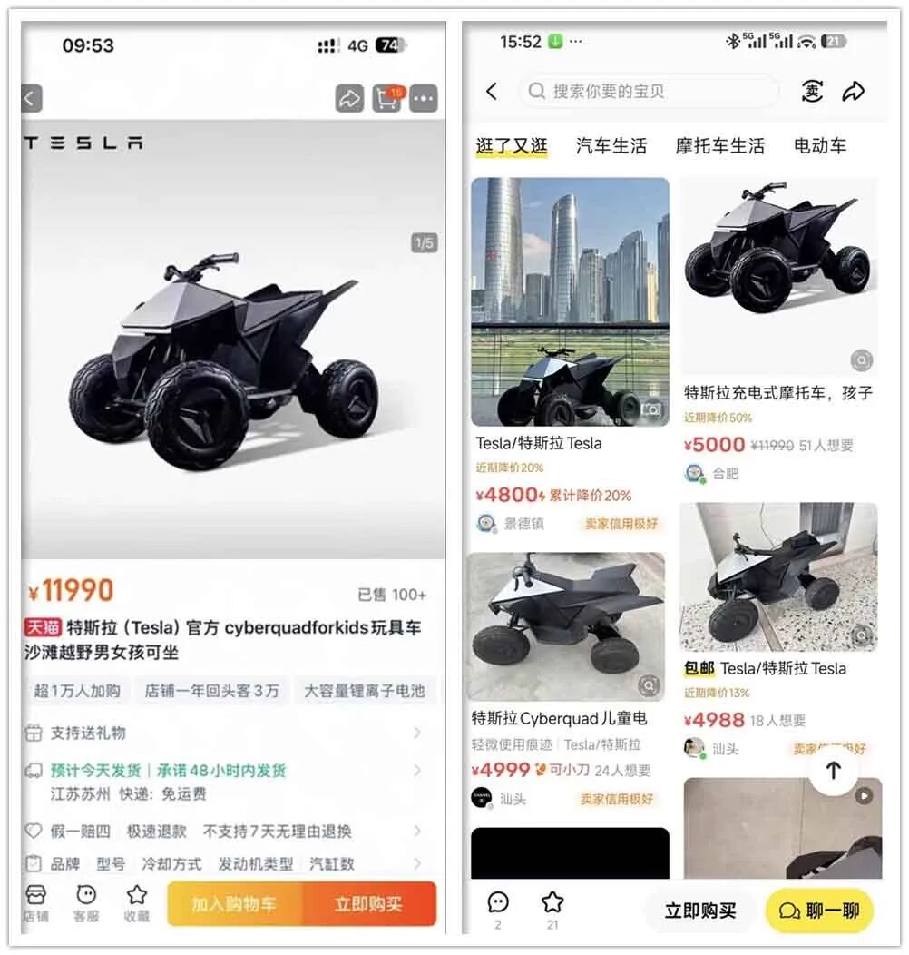 后来我研究了一下这车,它的北美版才是“完全体”,不但续航高达40km,而且最高时速是18km/h,连成年人都会买去当沙滩车玩。不过北美版更贵,闲鱼有人卖全新现货,标价是惊人的37800元,快赶上一部微型轿车了。