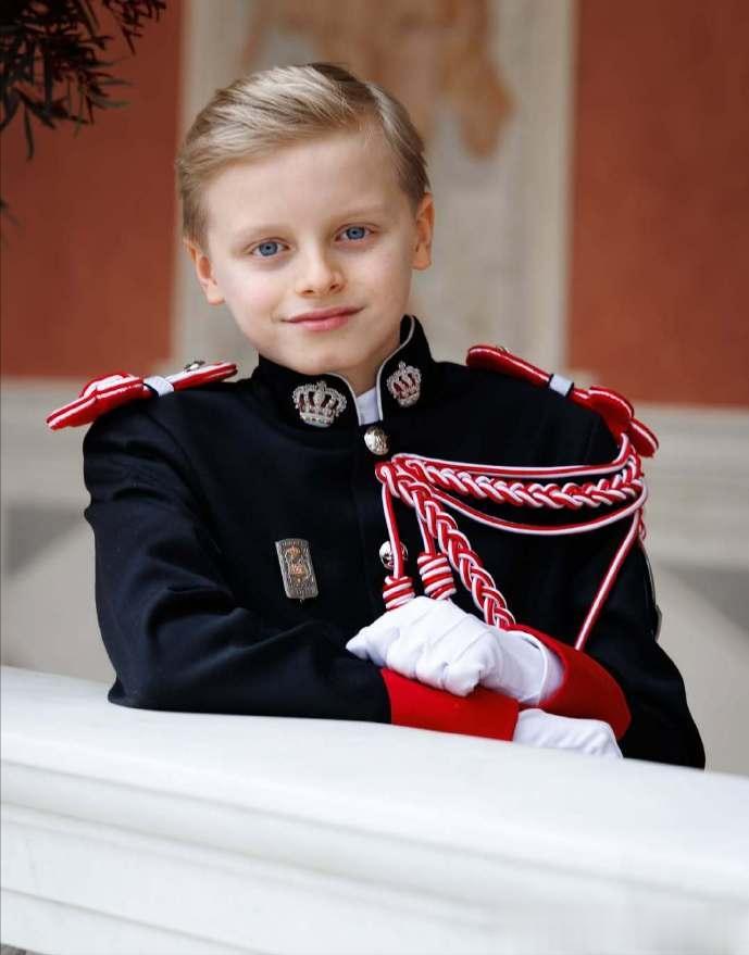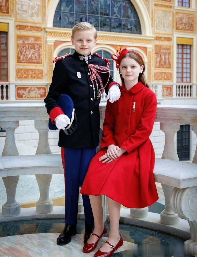 一家四口全家福,温馨满满。而龙凤胎也有自己的合照和单人照。合照中,小公主加布里拉公主穿着红裙和红色单鞋,端坐在阳台椅子上,仪态优雅,相当有公主范儿。而小王子雅克王储则穿着和父亲一样的军装制服,一手拿着礼帽,一手搭在姐姐的肩头。