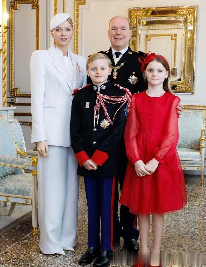 庆祝活动结束,摩纳哥王室也按照惯例公布了当天亲王一家四口最新的全家福。龙凤胎虽然才10岁,但是继承了妈妈夏琳王妃的身高优势,两人身高已经达到了夏琳的肩膀,目测应该有140以上了。