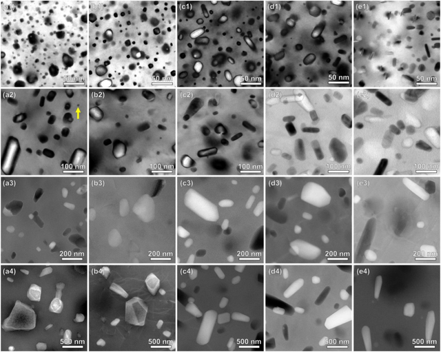 首先,研究了不同Zn/Mg比合金在150 °C-300°C热暴露过程中的硬度和电导率变化,A1−A5合金的硬度随热暴露时间的增加而降低,而电导率则呈相反的趋势(图1),这与热暴露过程中微观结构的变化息息相关。硬度的下降归因于析出相在热暴露过程中的粗化。T′和η′析出相在热暴露过程中逐渐转变为平衡相,其尺寸显著增大(图2),导致析出相与铝基体失去全共格或半共格关系。基体中残余溶质原子由于析出物的粗化而耗竭,使得基体的晶格畸变减小。因此,基体对电子的散射变弱,提高了合金的导电性。