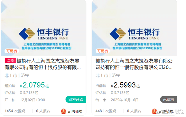 近日,阿里法拍网披露,上海国之杰投资发展有限公司(下称“上海国之杰”)持有的恒丰银行股份有限公司30190万股股份,将于2025年12月2日开始拍卖,起拍价2.0795亿元。此前,该笔股份起拍价为2.5993亿元。亦即:此次起拍价下降约0.52亿元。
