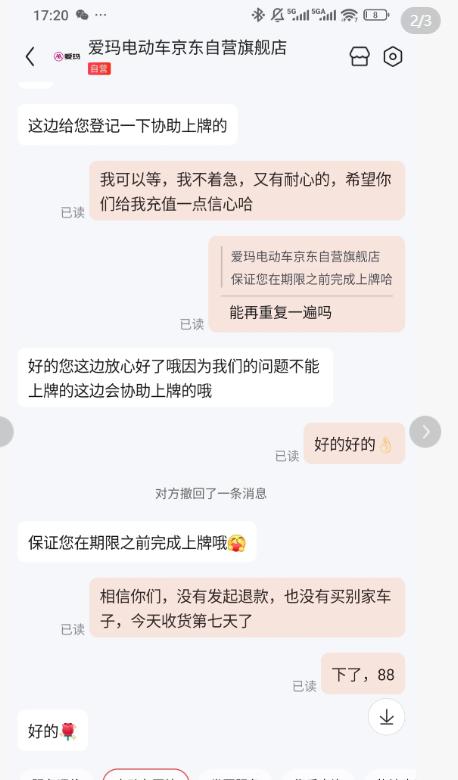 针对京东客服的这一系列操作,消费者表示,无语了,买的时候信誓旦旦能上牌,我发现无法上牌后,爱玛客服各种指天画地承诺一定能上牌,京东客服也劝我说再等等,一定能上牌。一直拖到过了7天无理由退货期过了后,立马告诉我这款车无法上牌....京东和爱玛真的就是连蒙带骗!作为一个消费者,我感觉自己好像一条狗啊,就这样被耍来耍去。