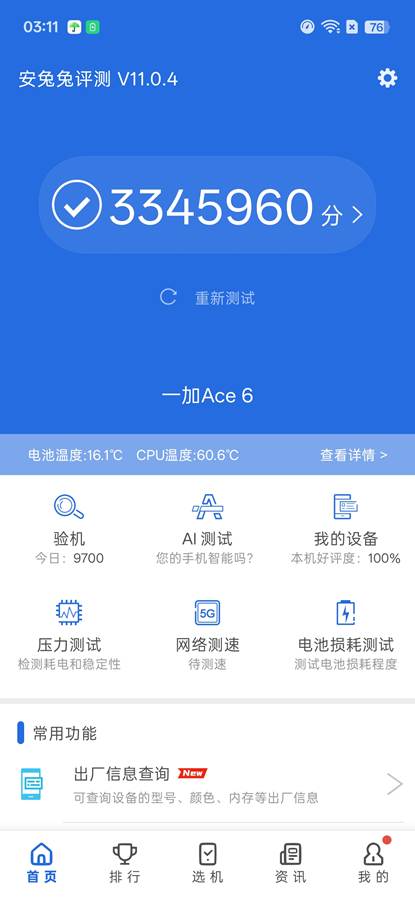为了保证游戏过程中的稳定性能输出,一加Ace 6搭载了全新「冰河散热系统」,采用全新大平层冰河VC,同时搭配超高性能石墨,热导率高达2100W/(m•K),并辅以3D冰河封装结构,迅速将芯片热量导出,实现芯片核心区域降温18℃。在实际游戏测试中,长时间运行高负载游戏后,手机的温度控制表现良好,没有出现明显的发热现象,确保了游戏的持续高帧流畅运行。