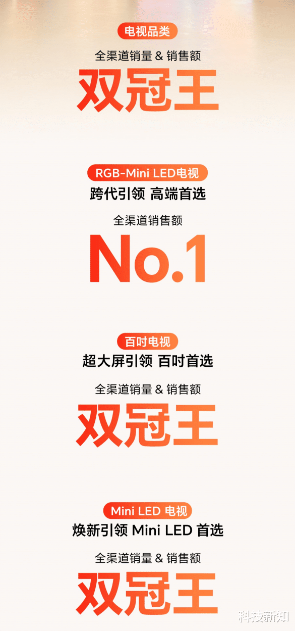 在新一轮百吋换新潮中,海信电视出色的画质表现和影游体验备受消费者青睐,以55.63%的销量占比和60.2%的销额占比,稳居百吋电视品类第一。受益于RGB-Mini LED在高端领域的技术引领和市场话语权,与海信的“大屏电视第一品牌”形成相互加速的双动力,带来了稳步提升的市场表现。