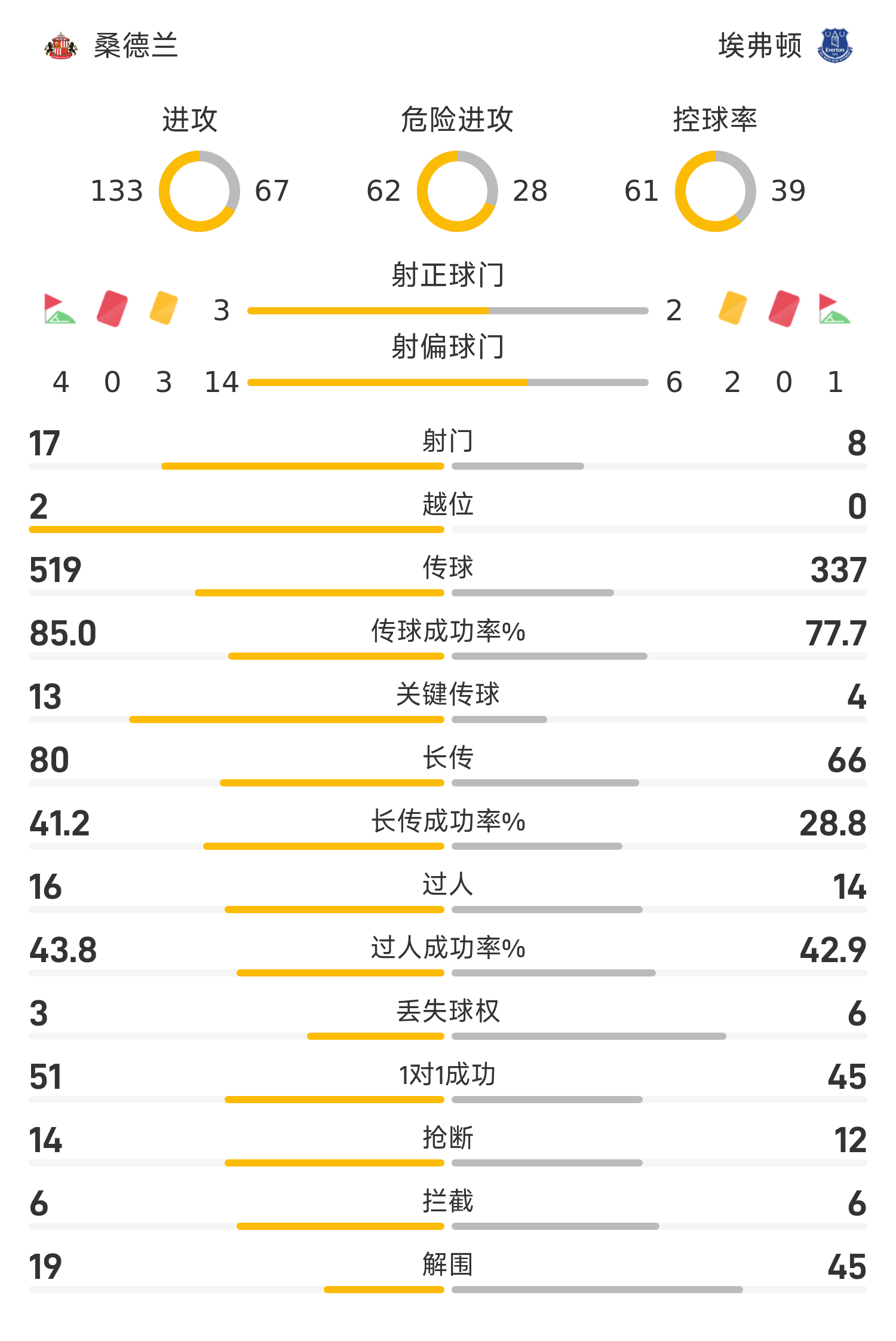 控球率方面,桑德兰以61%对39%占据绝对优势。
