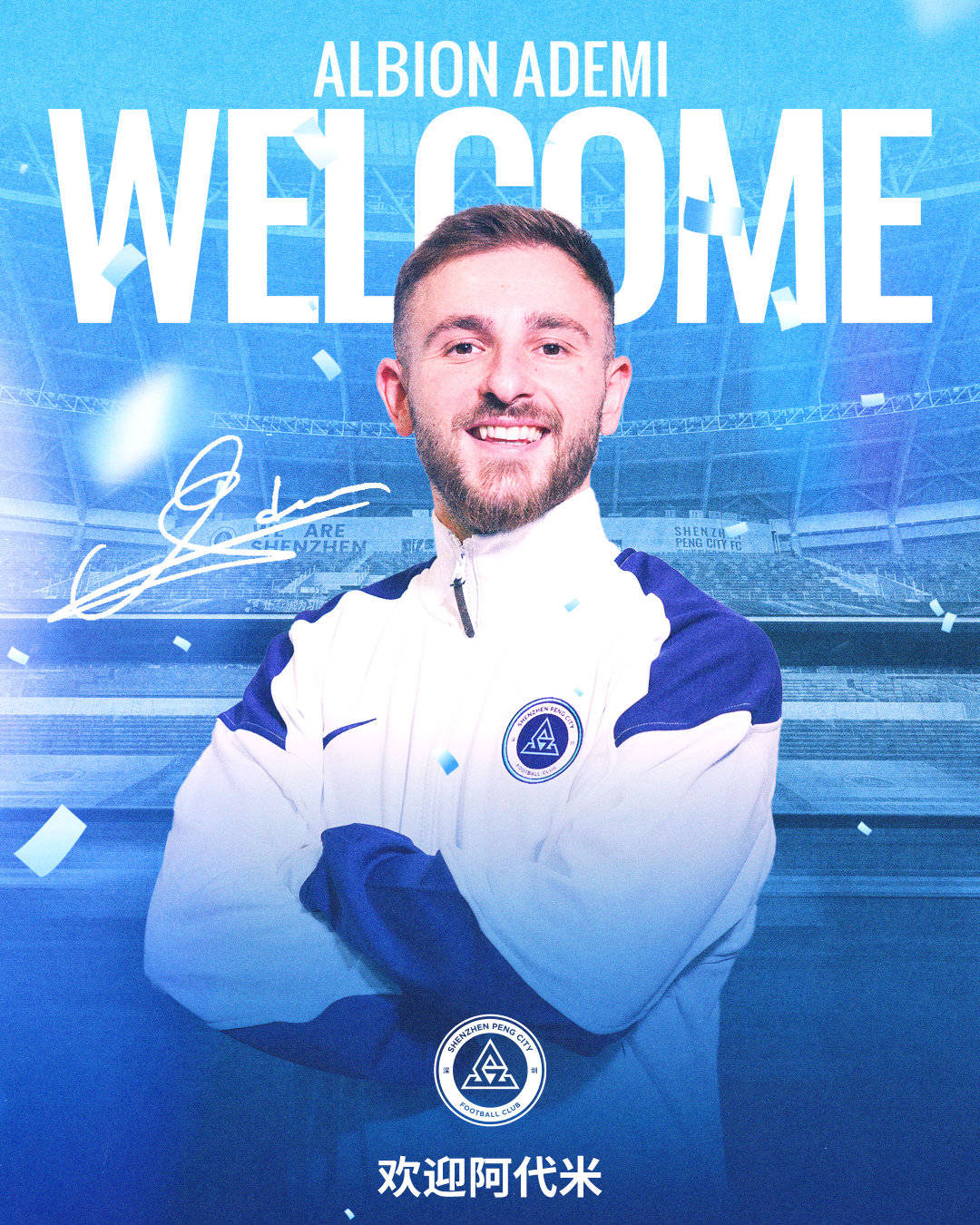 深圳新鹏城足球俱乐部今日宣布,阿尔比恩·阿代米(Albion Ademi)正式加盟球队。