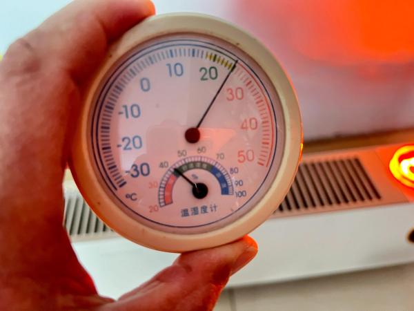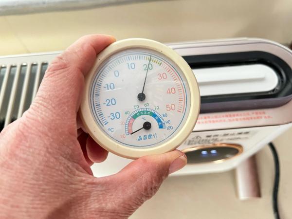 大家知道,北方不但气温低而且空气还相当干燥,尤其是在室内开启加热器后会更加干燥,人们长期呆在干燥环境下很容易上火难受喉咙疼。贴心的是这款取暖器搭载了全屋加湿设计:配备了一个加湿器,在右边操控区里面设置了一个水箱。这样,可以实现加热的同时,通过湿热空气对流扩散到整个屋子,给室内空气增加湿度,在润物无声的情况避免了空气过度干燥。这个加湿器采用了红色的LED灯设计,雾化出来的水气配上灯光效果如同壁挂炉火,很有氛围感,光线还柔和不刺眼。下图是对加湿器附近和室内的湿度测试结果。结果显示,开机后一个小时的湿度已经处在舒适的绿色范围内了。