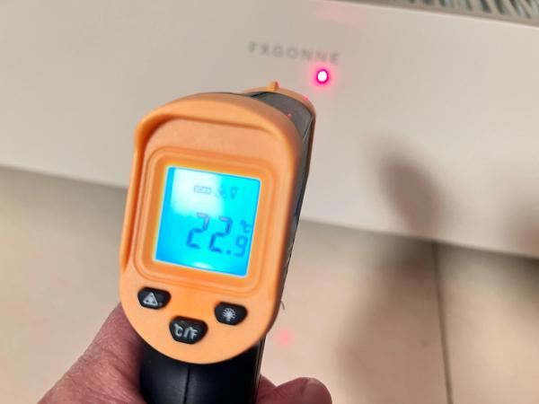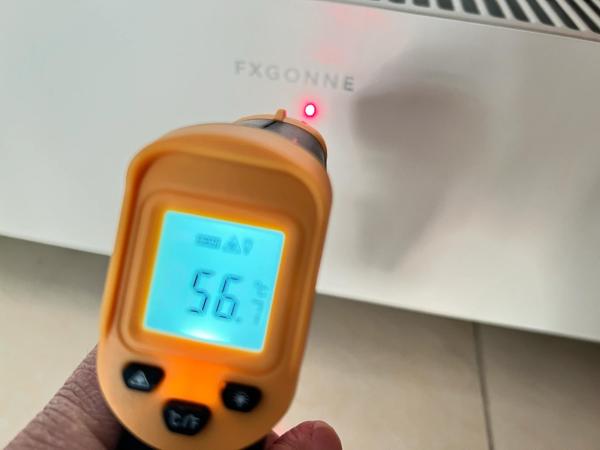 有资料显示,宫菱踢脚线取暖器的热效率比同类产品高3倍以上。这都得益于其创新的超大尺寸层叠式加厚超导石墨烯速热、高间隙+碟片式散热、SOR超级持续加热等黑科技。在20平米的卧室内,将取暖器设置在高温档,温度为27 ℃,用红外测温仪在不同时间段实测了不同区域的温度。实测发现,开启高温档后,取暖器机器居中位置的温度迅速升高,同时,周围空气温度也随之上升。开机后不到20分钟温度从21.7℃上升到200.6 ℃,那是相当高啊;机器附近,温度从23.5℃上升到35.1 ℃.这样的加热能力相当令人满意。