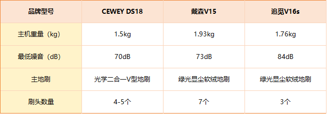 从使用体验来看,CEWEY DS18 延续了轻量化与静音设计,主机重量仅1.5kg,噪音控制在70dB,使用时手感轻盈,操作舒适。搭载光学二合一V型主刷与4~5个多功能刷头,能适应不同清洁场景。戴森V10主机重量偏高,噪音也是。追觅Z20增强款整体更偏向高功率机型。综合来看,CEWEY在轻量、静音和刷头配置灵活度上表现更出色,尤其适合注重操作手感与舒适度的家庭用户。