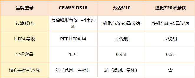 从过滤系统来看,CEWEY DS18 采用复合锥形气旋+4重过滤系统,并明确搭载PET HEPA14高等级滤芯,过滤精度达医用级标准,能有效隔绝粉尘与过敏源。其1.2L尘杯容量在三款产品中最大,同时滤网和尘杯均支持水洗,后期维护更便捷。戴森V10与追觅Z20增强款均采用多锥气旋+5重过滤设计,但未标注滤芯等级。总体来看,CEWEY在滤芯等级、尘杯容量与维护便利性上优势明显。