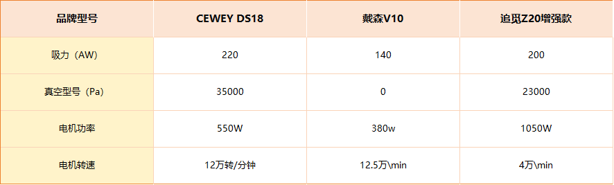 我们将聚焦决定吸尘器吸力性能的几个关键指标:官方公布的最大吸力值(AW)、真空度(Pa)、电机功率和电机转速。通过这些核心参数,我们可以分析各款产品的理论极限性能和技术侧重。