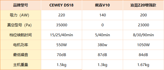 从性能数据来看,CEWEY DS18 保持了旗舰级的动力配置。它的大吸力和高真空度,加上电机功率550W,和配合12万转/分钟的高速无刷电机,实现了稳定且高效的吸力输出。相比之下,戴森V10的吸力相对较低,适合日常轻度清洁使用,而追觅Z20增强款的功率虽高达1050W,但转速仅有4万转每分钟,更偏向大功率短时清洁。整体来看,CEWEY DS18在吸力强度与能效平衡上表现最为稳定。