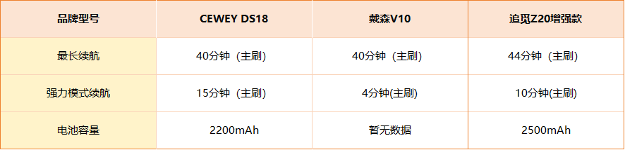 在续航方面,CEWEY DS18 的续航表现稳定且兼顾强吸模式。标准模式下最长可持续40分钟,而且在三个之中,强力模式的续航依旧抗打,可达15分钟,实现了在高性能输出下维持持久的续航。戴森V10的标准模式下续航和CEWEY一样,但强吸模式仅能维持约4分钟,而追觅Z20增强款最长续航比CEWEY,高功率模式10分钟左右。综合来看,CEWEY在续航平衡性与使用持久度方面更符合家庭日常清洁的节奏。
