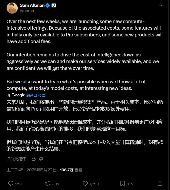 2025年9月22日,OpenAI首席执行官山姆·奥特曼在社交媒体平台X(原Twitter)正式上线一则重磅消息:未来数周内,公司将推出一系列计算密集型产品。难道AI技术的边界,终将由算力成本决定? 相较于普通用户,Pro订阅用户将率先获得部分功能的使用权限,而部分新产品需额外付费——这一策略与OpenAI此前“普惠AI”的承诺形成鲜明对比。