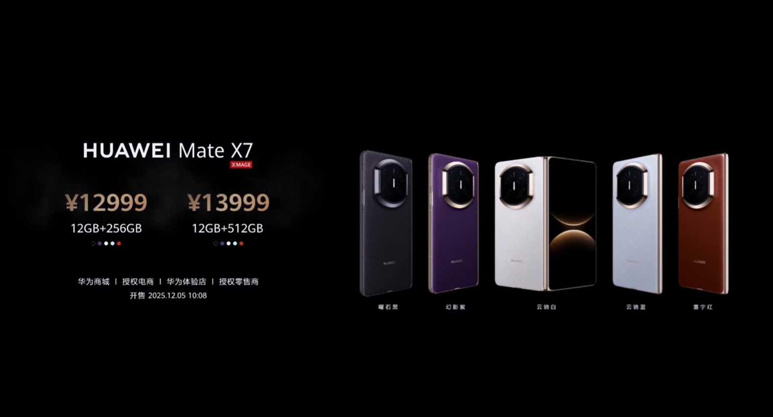 价格方面,Mate X7 12GB+256GB版起售价12999元,12GB+512GB版13999元;典藏版16GB+512GB版14999元,16GB+1TB版15999元;最高20GB+1TB手写笔套装版售价17599元,将于12月5日10:08正式开售。