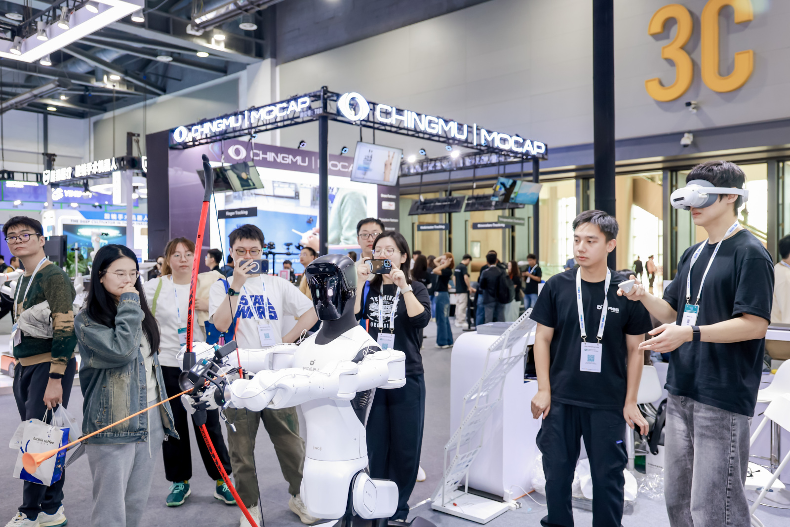 刚于 10 月 16 日发布的精灵 G2,此次首次线下公开亮相展会引发关注。这款工业级交互式具身作业机器人,搭载两条 7 自由度工业级机械臂,额定负载达 5kg 且配备关节力矩传感器,可实现亚毫米级高精度力控作业,完成力控搜孔、插接、贴平等精细操作;其 3 自由度腰部与 2 自由度折叠升降腿部设计,能复刻人类腰腿部动作,实现上下肢协同的复杂操作,进一步拓展人形机器人的应用场景。此外,观众们还可在智元展台体验一把机器人射箭,现场感受精灵G2遥操作的超低延时和超高精度。