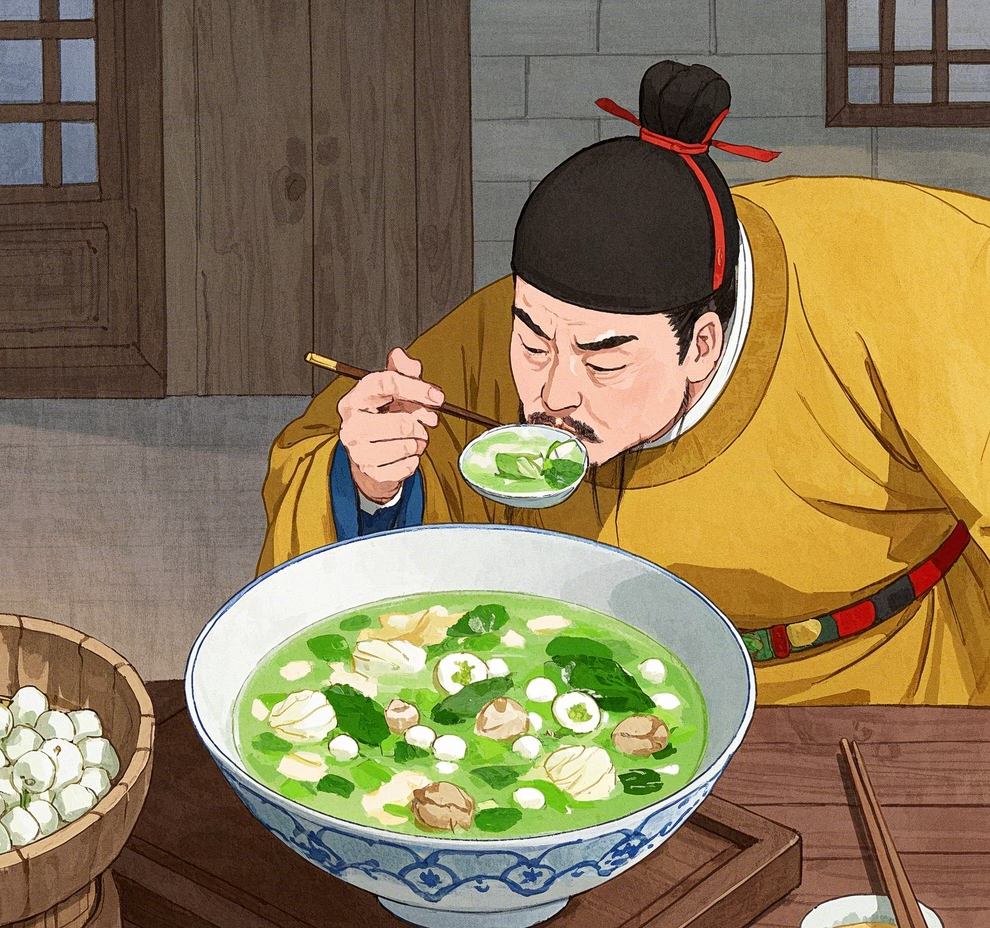 御膳房里,大厨们接到圣旨,顿时炸开了锅。御厨刘一手愁眉苦脸地对众人说:“各位师傅,这可咋整啊?这汤的食材实在是寒碜,咱要真照原样做了,皇上一怒之下,咱们的脑袋可都得搬家!”旁边的张胖子也附和着:“就是就是,这可难办咯!” 但圣命难违,大厨们只得硬着头皮上。他们用上好的嫩豆腐切成精巧的小块,权当是白玉;精心挑选菠菜最嫩的叶子,寓意翡翠;又用圆润饱满的西米代替珍珠,接着小火慢熬,还加了各种珍稀名贵的香料提味,最后小心翼翼地摆盘,这才端着盘子战战兢兢地送了上去。