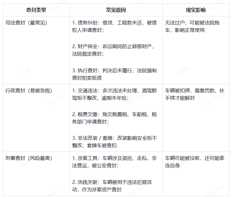 看绿本(登记证书):翻开备注栏,若有 “法院查封”“司法查封” 字样,直接判定为查封车;