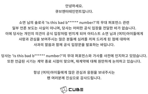 随着事情愈演愈烈,cube公司发表公告称“对于小娟个人舞台表演的相关部分媒体报道不属实,本公司没有传达任何正式立场。个人的意见像正式立场一样扩散,给一直爱护艺人小娟和(G)I-DLE的人们带来了麻烦,对此表示歉意,并发表正式立场。