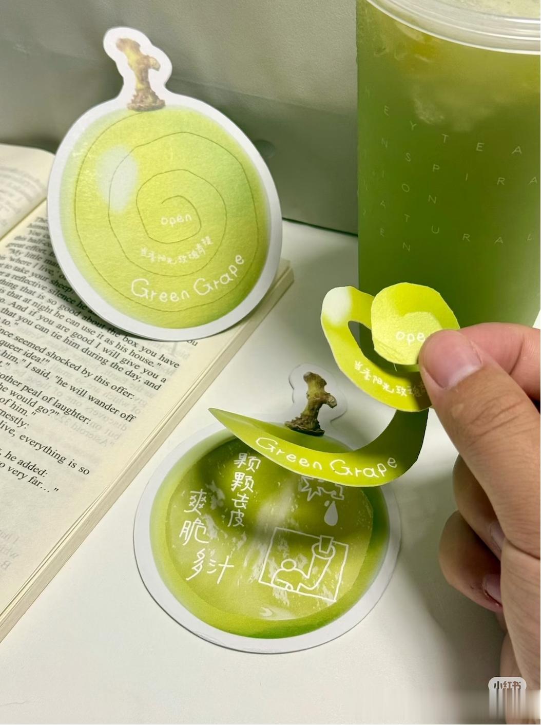 小卡背后的故事充满惊喜,但这种“心机”还不够,喜茶还让小卡们能被“玩起来”。多肉青提的小卡就巧妙地设计成盘香造型,让人能亲手体验“剥”开葡萄皮的快乐。