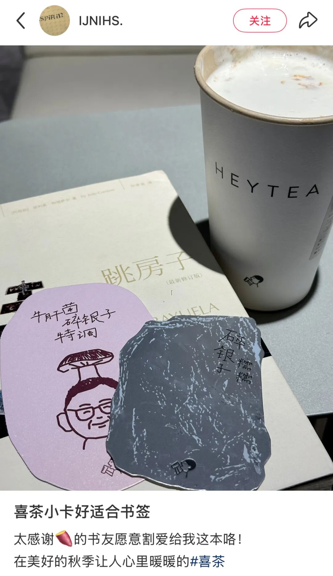 在后续推出的新品中,喜茶延续了灵感小卡这一形式,并随着受到的关注越来越多,逐渐将其沉淀为上新时的固定周边。它就像这杯茶的“专属名片”,让消费者在品味之前,先感受背后的灵感与故事。