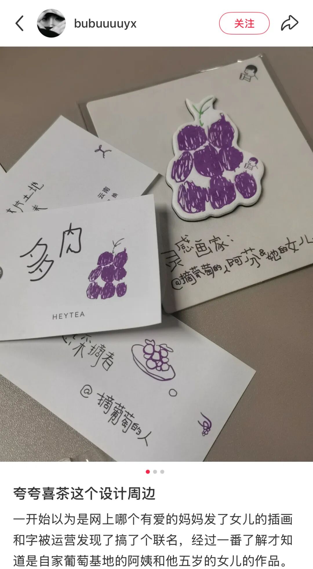 “怪可爱的”多肉葡萄小卡,是喜茶邀请云南建水葡萄基地采摘者阿芬的五岁女儿绘制的。这种自带人情味的卡片,让不少网友直呼“有被治愈到”。