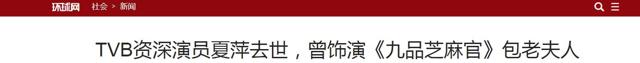 TVB资深演员夏萍去世,曾饰演《九品芝麻官》包老夫人 来源:澎湃讯 2019-8-12 17:51