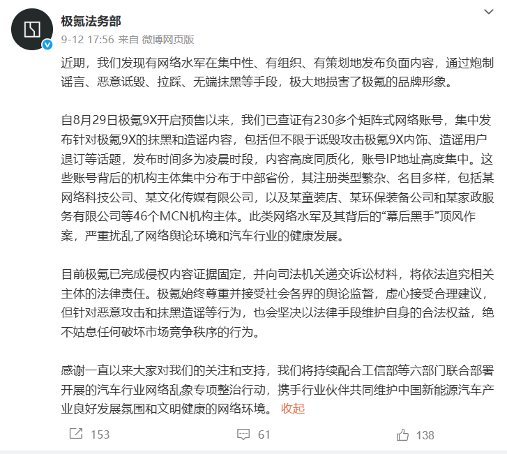 而今六部门联合印发《关于开展汽车行业网络乱象专项整治行动的通知》,对整个行业来说绝对是个利好消息。车企们随即积极配合,极氪、蔚来相继发文,针对恶意抹黑事件,表示将依法追究相关主体的法律责任。不光是政府和车企,希望接下来也能有更多消费者抵制这些乱象,只有多方共同努力,才能让国家的汽车产业更进一步!