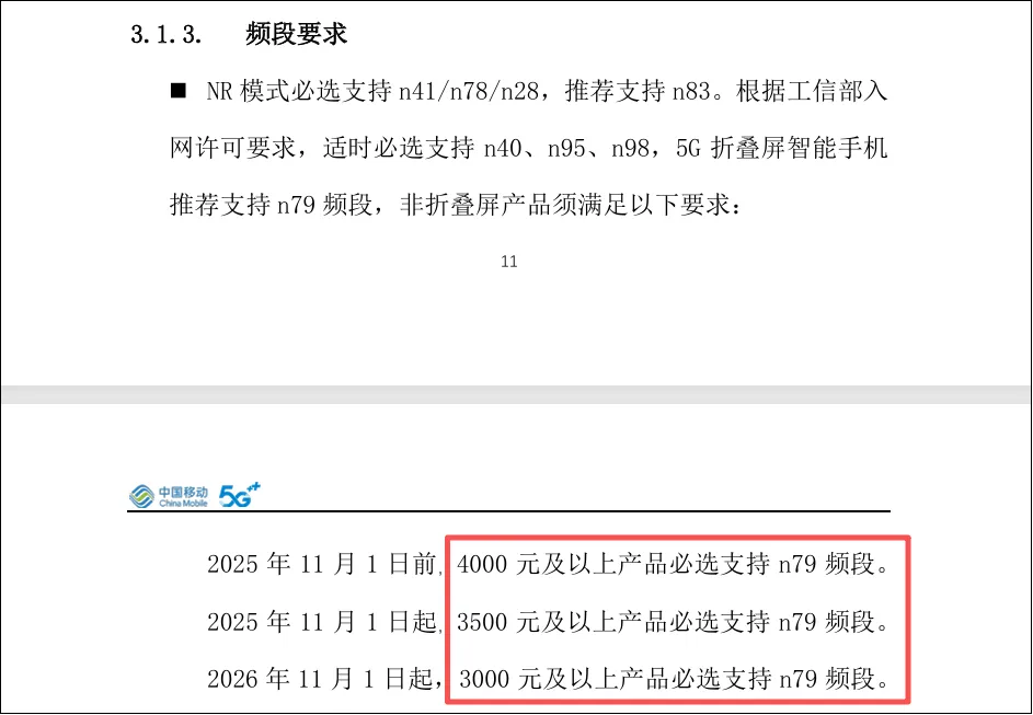 中国移动最近出了白皮书,并对手机做了要求:2025 年 11 月 1 日前,4000 元以上的 5G 手机必须支持 n79 频段。可能有人不懂这频段啥意思 —— n79 是 4.8-4.96GHz 的中高频段,专门覆盖城市密集区、商场、体育馆这些人多流量大的地方,网速比现在的 n78 更快更稳。现在很多中端机都没支持这个频段,意味着年底前想买高端机,必须选支持 n79 的机型,不然可能面临网速卡顿、信号差的问题。