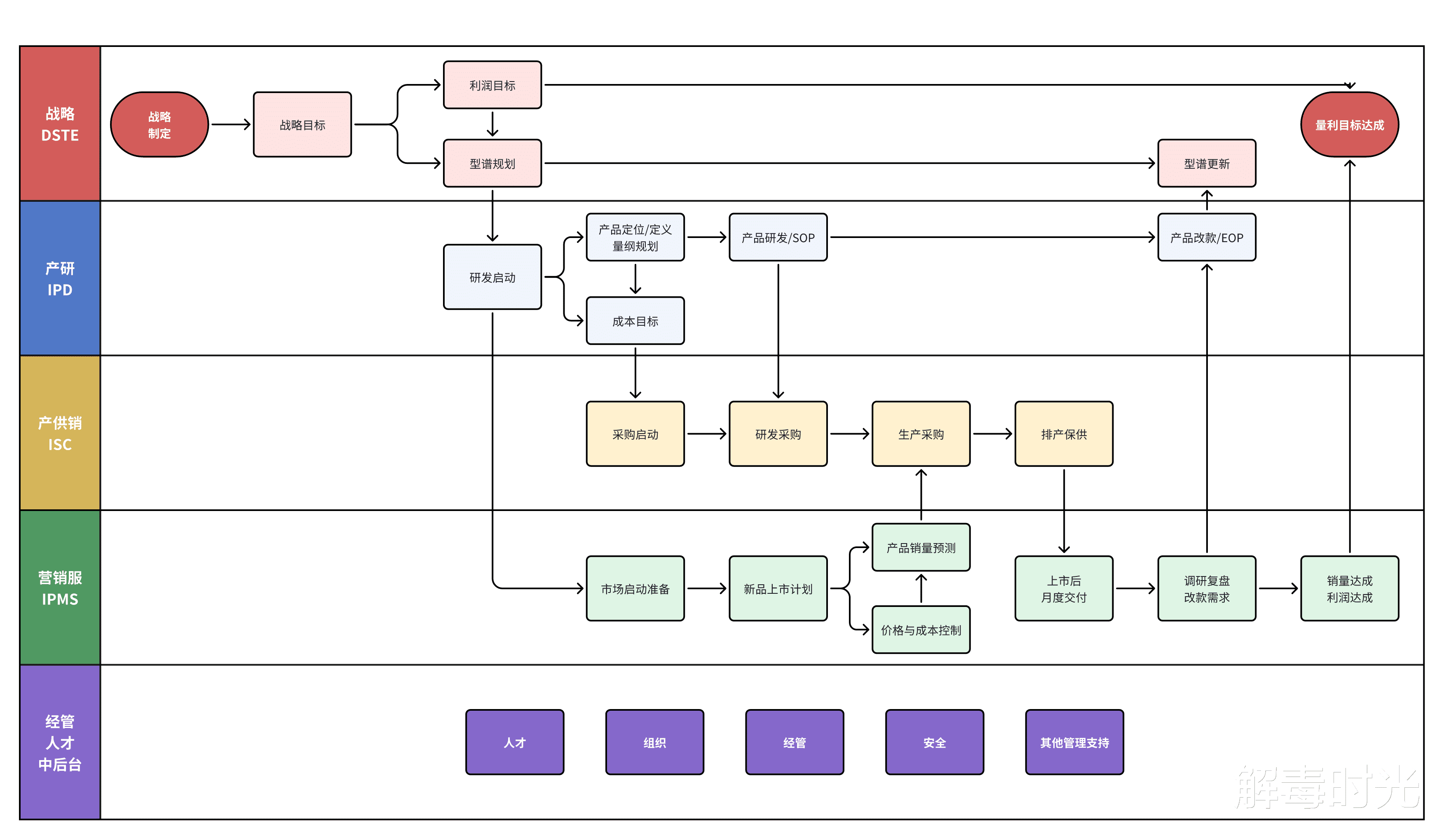 战略永远是粗线条和规划性的,我们必须进一步深入到汽车行业的关键——生产一辆车并销售出去,在这个维度上将流程进行细化。首先在DSTE环节就是要明确目标和资源,比如确定大概造一辆什么价位段、满足什么需求的车,预计销售多少以及要投入多少资源。进入到IPD环节就要对产品进行定位,基于定位选择相应的技术、落实相应的配置,以及基于这样的组合进行研发工作;信息传递到ISC环节就需要根据IPD要求进行供应商的选择、生产预测以及生产管理。