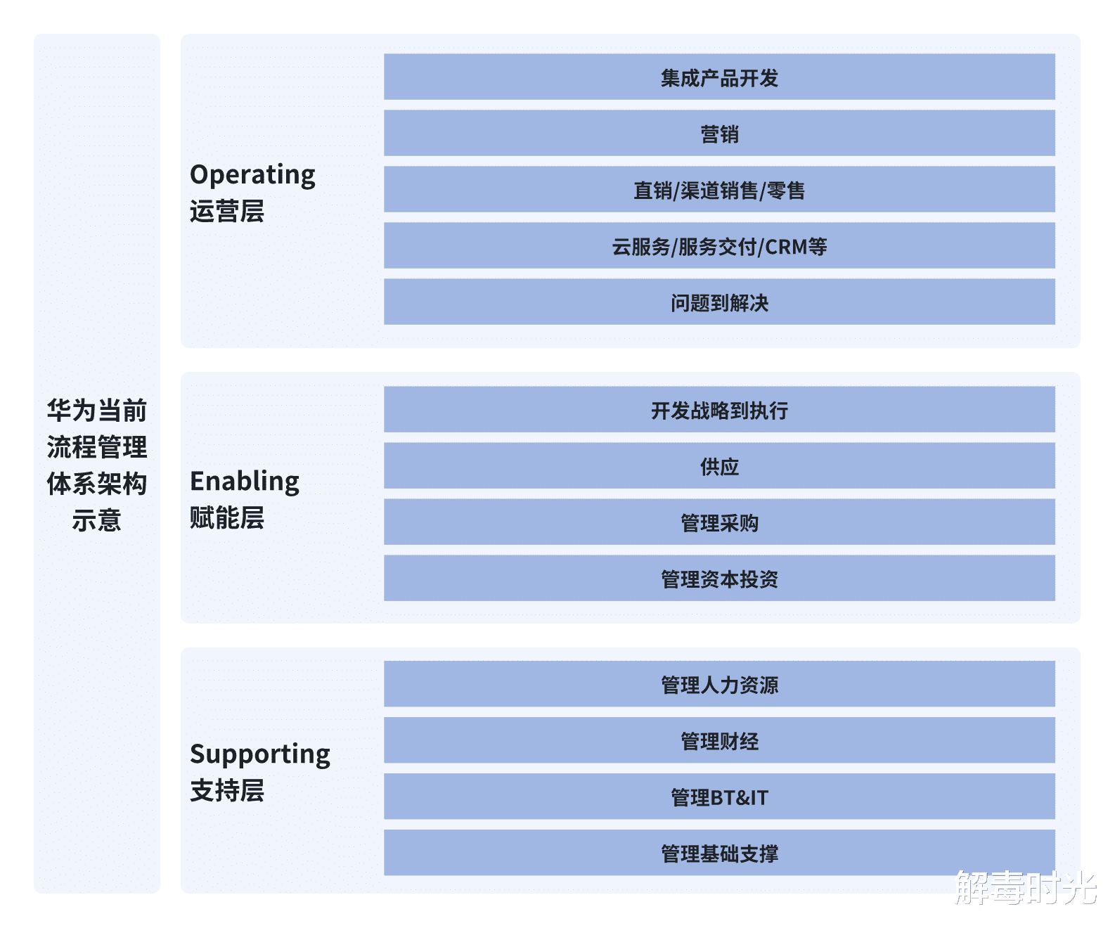 关于赋能层和支持层就不再展开,大多涉及到回答一个问题——如果想要好的完成运营层的业务,应该有哪些配合的流程,包括战略、供应、采购、资本、人力、财经、IT、流程变革等等。这就是华为流程建设和应用的基本思路和大概框架。