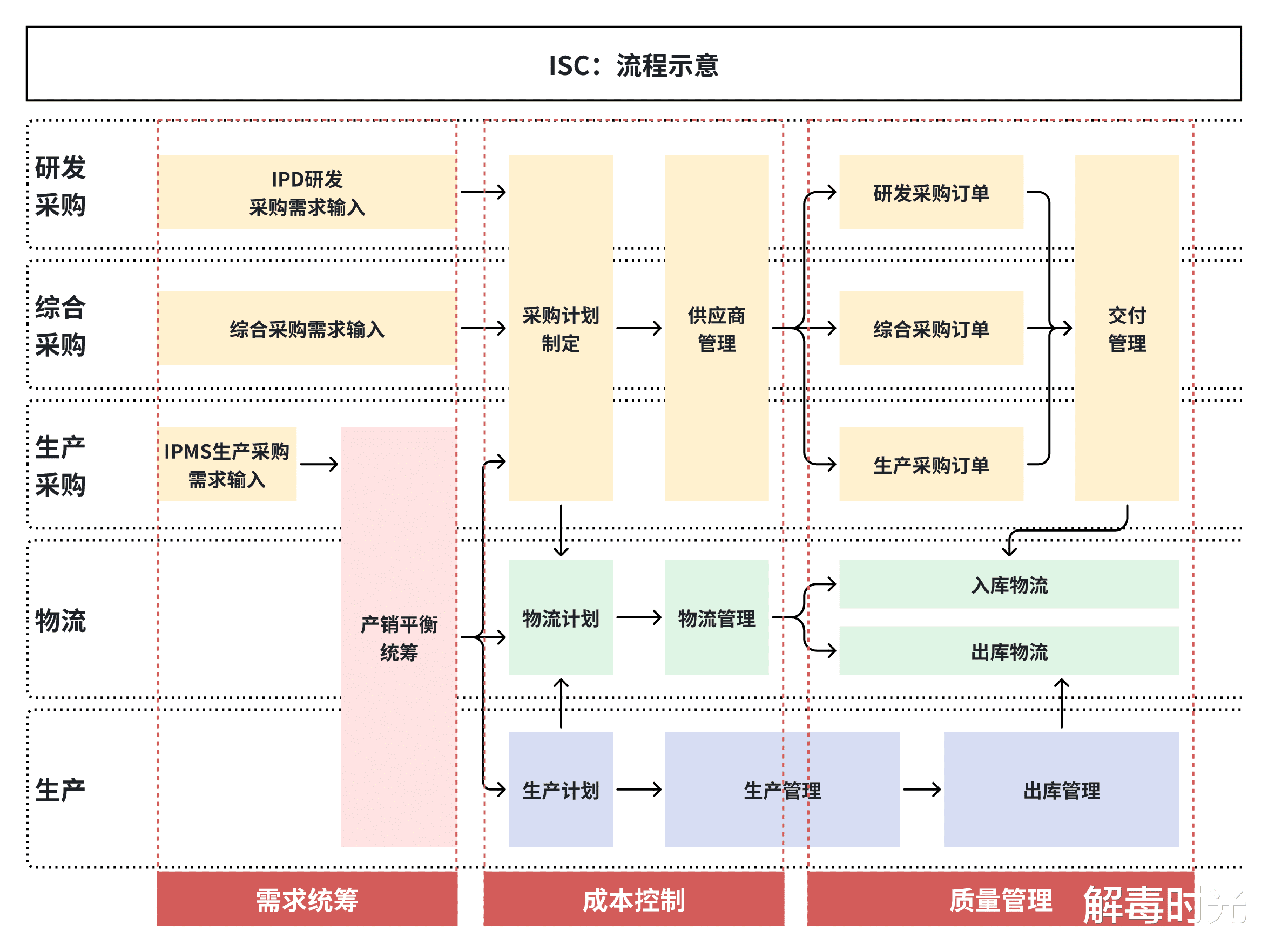 为什么何小鹏在谈到流程体系的时候,要强调横向流程?因为在小鹏的组织内,流程更多的是为了打通组织之间的信息壁垒设置的。比如以ISC流程为例,一个符合要求的ISC流程要满足在需求统筹、成本控制以及质量管理三个层面的要求,同时覆盖研发采购、综合采购、生产采购、物流以及生产几个大的业务模块。通过流程节点上的输入输出关系的绑定,将业务当中的不同组织,以目标和任务流为中心绑定起来,这样才能做到所谓业务互锁,并目标方向统一,产生组织之间的合力。