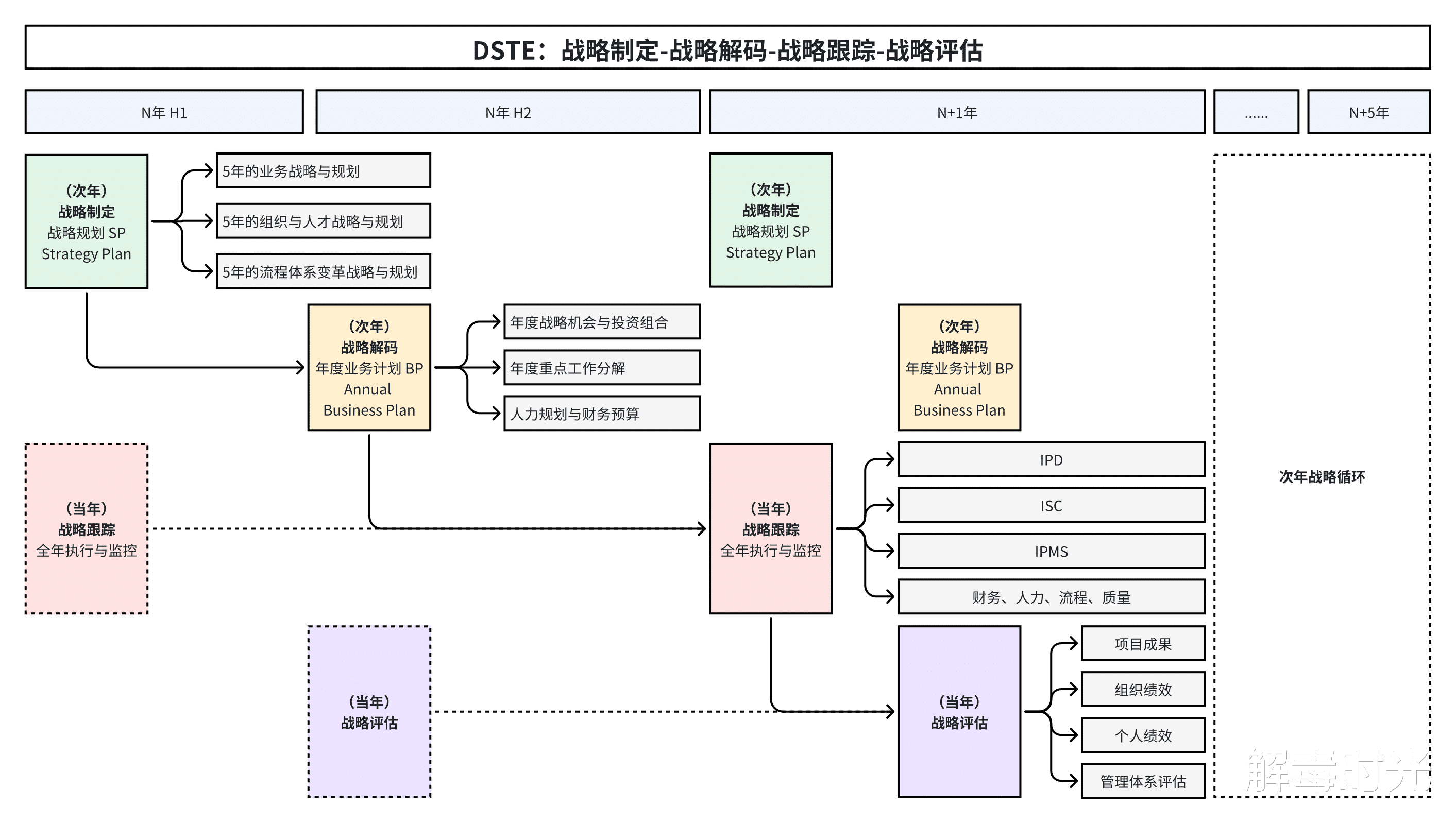 一般来说,通行的DSTE会以3年或5年为战略制定所覆盖的周期,以一年为战略刷新的周期。在一年的周期中,首先进行的是长周期战略的制定(SP,Strategy Plan),这其中包含了5年的业务战略,以及与之配套的组织人才战略,同时还可能包括流程体系变革的相关战略;有了这个战略之后,就进入到战略解码阶段,会输出年度业务计划(BP,Annual Business Plan),其中包含了年度战略机会与投资,年度重点工作分解,年度的人力规划和财务规划等诸多在一年中可以执行甚至完成的事情。