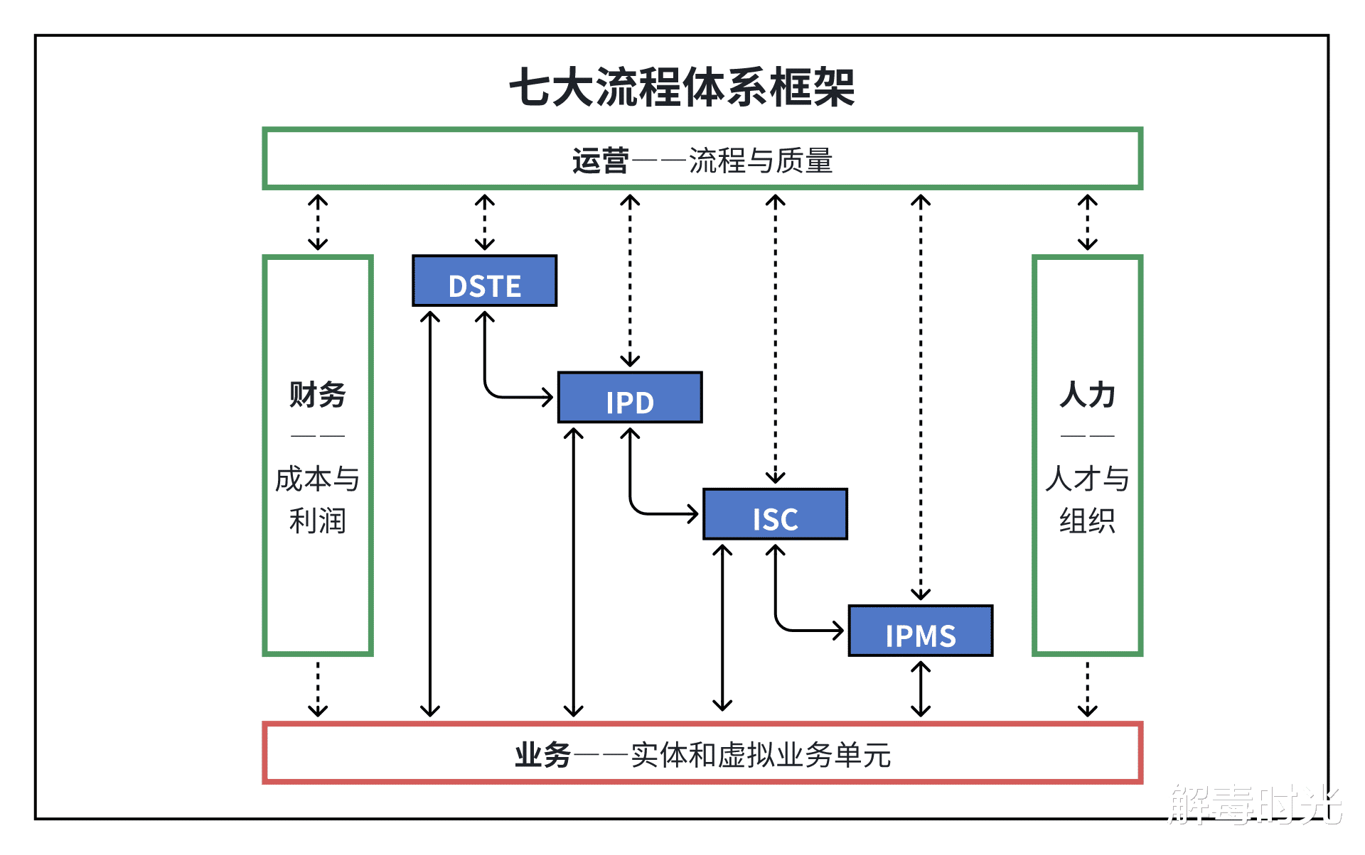 基于DSTE的循环滚动,理想的七大一级流程才能够有一个动力的源头,由此构成了DSTE推动三个核心业务流程IPD、ISC、IPMS以及三个支撑性的财务(关于成本与利润)、人力(关于人才与组织)和运营(关于流程与质量)的运转,将执行具体业务的实体单元和虚拟单元带入后,企业的总体运转进入到一个稳定的循环当中。