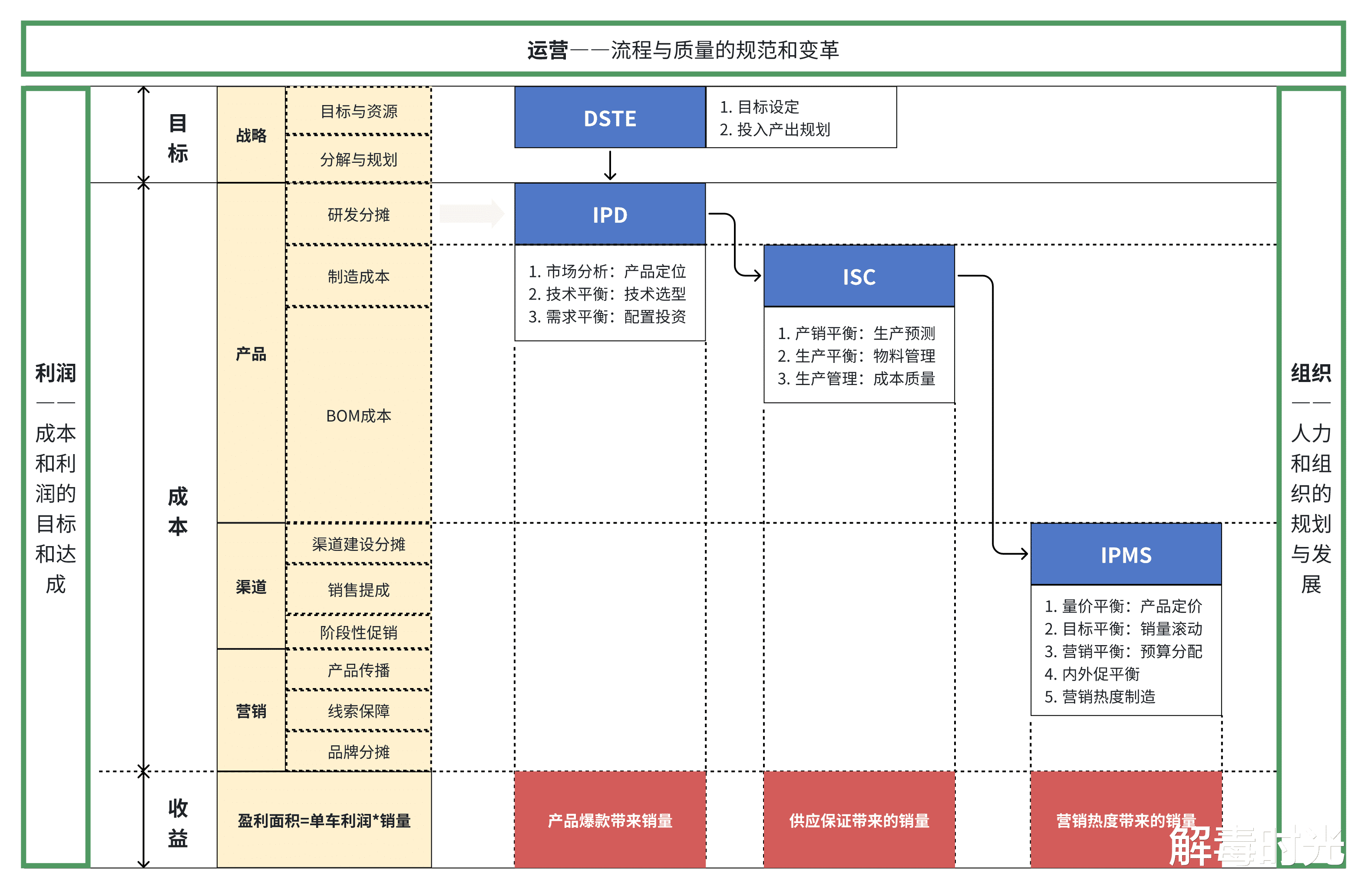 当完成这些之后,整体的收益就来自于单车的利润与销量的共同贡献。困扰很多企业的问题是——销量从何而来?其实从这几个关键流程来看,每个流程都会给销量带来贡献。比如IPD洞察用户需求将产品打造成爆款可以带来销量,ISC供应及时且质量可靠也能够带来销量,营销制造出热度更能够为销量助力。企业真实的运作并非流程架构这样的简单,但在此也仅仅是将关键内容抽象出来,以方便更好的理解。