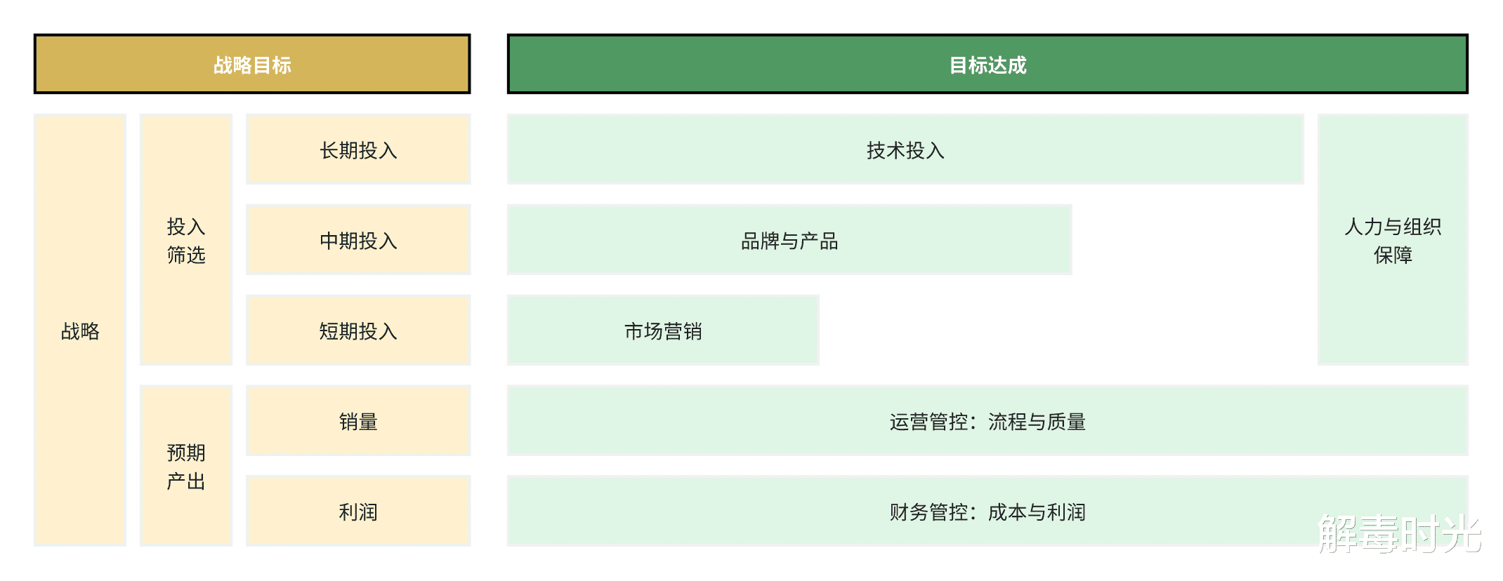 好的战略还要对应着好的执行,对于汽车企业来说,长期投入大多属于技术类的投入,中期则是品牌和产品,短期就是赢得当下成绩的市场营销,当然与这三类投入配合的还有人力与组织的保障与建设。在产出的层面,需要用运营的管控来保证销量,同时还需要用财务管理来平衡成本与利润。